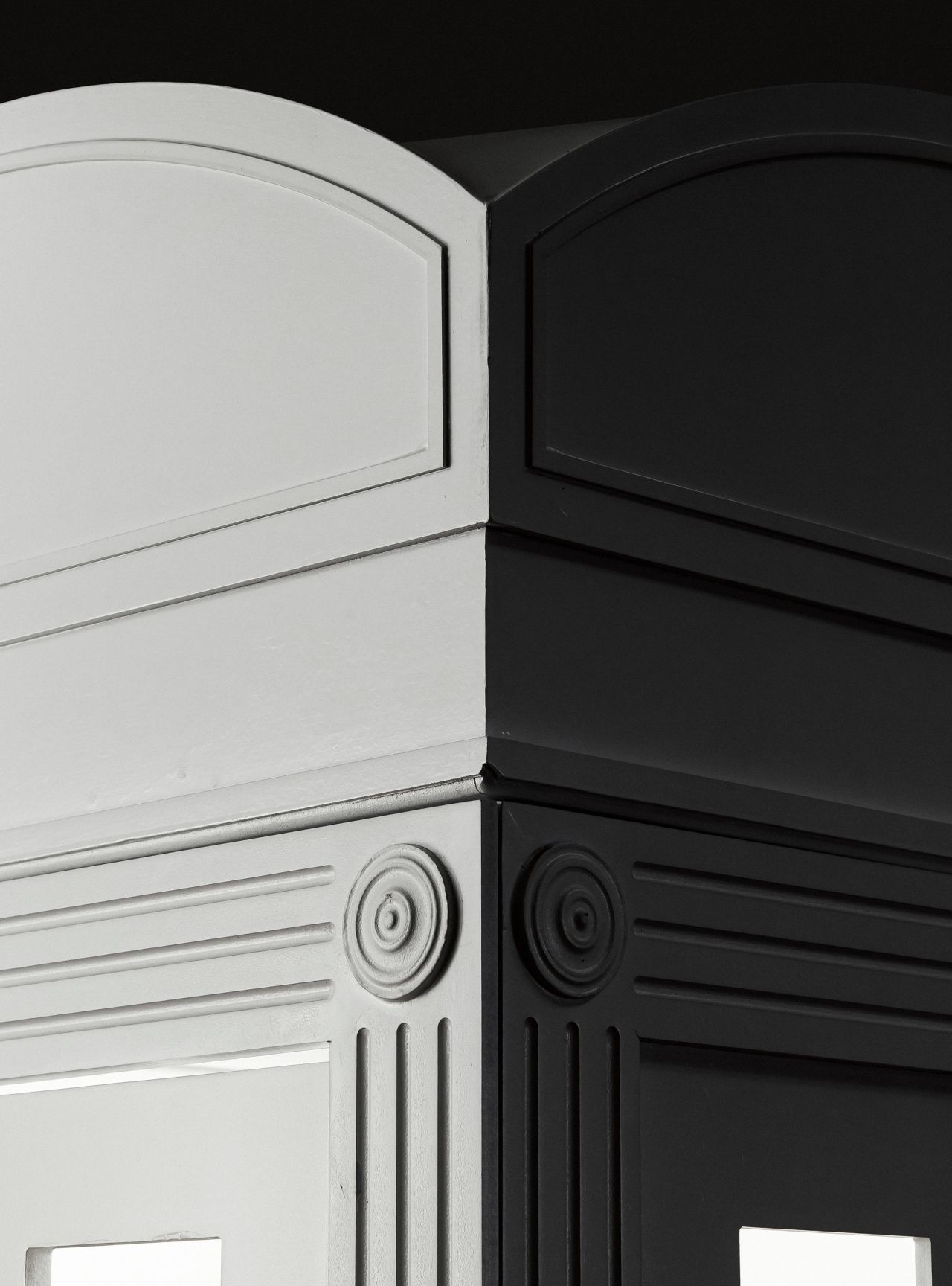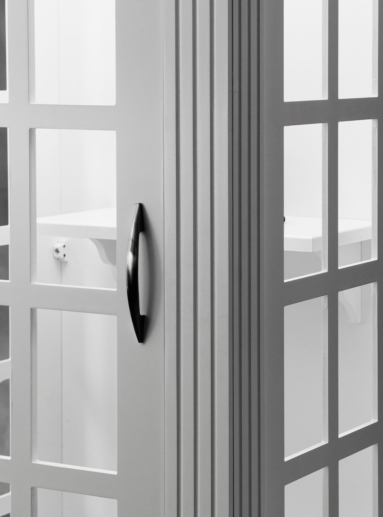 This custom-designed wine cabinet was entirely crafted in our studio, based on specific dimensions provided by the client as the the only one specification. Its creation represents a balance between the clarity of form, timeless aesthetics, and functionality. The construction consists of two distinct parts: the main body of the cabinet and its legs. The cabinet's body serves as a display case, featuring a load-bearing frame made from solid American walnut, with side panels veneered in walnut, where the wood grain runs seamlessly around the perimeter of the piece. The form is semi-circular at its edges—a signature element of our design identity—enhancing the flow and smoothness of its overall geometry. Perforated side panels with a repeating geometric pattern are integrated, providing controlled transparency and light management, further contributing to the visual brightness of this item. The doors are made from solid walnut and are fitted with safety glass, maintaining the required durability and aesthetic clarity. The handles are entirely handcrafted from solid brass, as are the other peripheral components of the cabinet, including hinges and screws. The choice of this material enhances the premium identity of the piece, creating an elegant aesthetic contrast with the deep, natural tone of the walnut wood. The base of the cabinet draws inspiration from Mid-Century Modern design, featuring angled, curved legs made of solid wood. These legs are integrated in such a way that they create a visual sense of levitation for the cabinet. Stability is ensured through cross-brass rods, which serve not only as structural elements but also as decorative accents of high aesthetic value. The final finish is achieved with matte acrylic varnishes to preserve the natural texture and color of the walnut while protecting the piece from everyday use. For the project's photo shooting, we collaborated with Papahatzis Home, which provided the glassware and decorative objects that highlight the cabinet's functional use and aesthetic integrity.